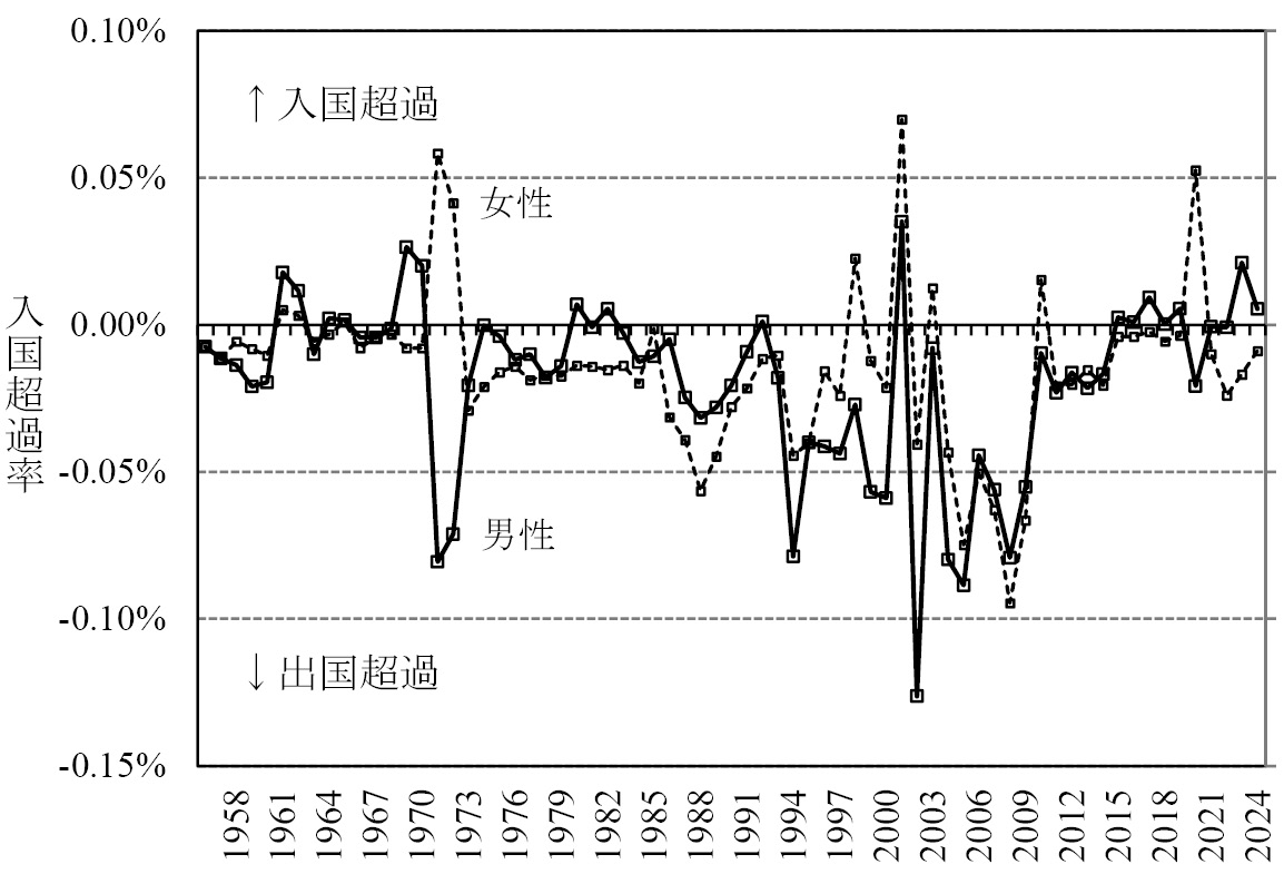 日本人の男女の出入国のパターンは1950年代にはおおよそ人口の0.01-0.02%程度の出国超過傾向を示していた。その後,1960年代に入ると出国よりも入国者の方が多い傾向が見られた。その後,1970年代に入ると日本経済のグローバル化に伴い,次第に出国傾向が顕著になっていく。こうした傾向は1980年代,90年代と強くなり,2000年代に入ってピークを迎えた。