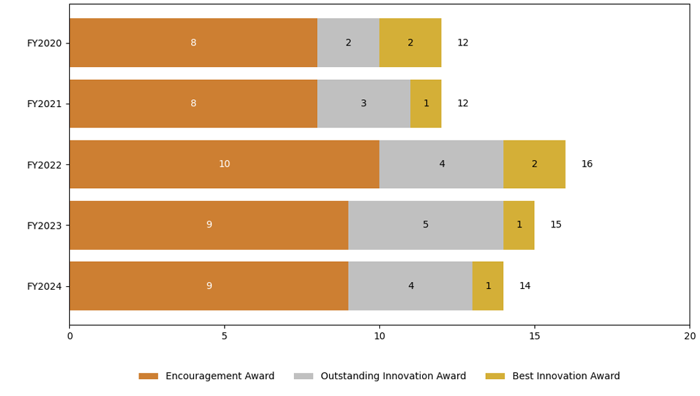 Over the five years from FY2020 to FY2024, the Award covered six countries and 41 institutions, recognizing a total of 69 achievements (7 Best Innovation Awards, 18 Outstanding Innovation Awards, and 44 Encouragement Awards). Annual award numbers ranged between 12 and 16, with limited year‑to‑year variation. By country, Indonesia had the highest number of award recipients, followed by Vietnam and the Philippines. Best Innovation Awards were primarily concentrated in Indonesia and Vietnam. (Figures 1 and 2)
