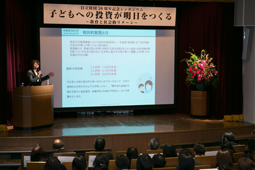 ここにあるのが「貧困の連鎖」で、日本の子どもの貧困の特徴を表しています。日本は、子育てと教育に非常にお金がかかる国で、親のお金(私費)が必要です。そのため、親の経済状態次第で子どもの将来が決まってしまうところがあります。親の収入が少ないと子どもは充分な教育が受けられず、進学や就職で不利になり、収入の高い職に就けない。それによって子どもの世代も貧困になってしまうという「貧困の連鎖」が起こります。この問題をどうにかしなければいけません。